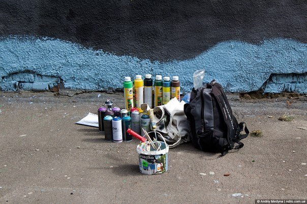 Так виглядала творча майстерня Романа Фесюка (на фото) — вихідця з Нововолинська, інженера-електрика за фахом. Він спеціально приїхав до рідного міста, аби розписати задню стіну кінотеатру.