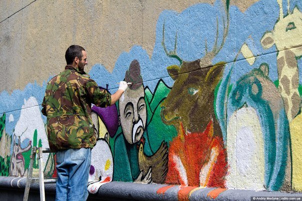 Сірий і запущений кінотеатр у центрі Нововолинська узялися розфарбовувати молоді художники, серед них і 29 - річний мешканець Луцька. Звісно, їхні зусилля на тлі обшарпаних дверей і тріщин у стінах виглядають відчайдушно наївними. Та й цеглина на голову митця чи вдячних глядачів може впасти — стіни ж бо обсипаються.