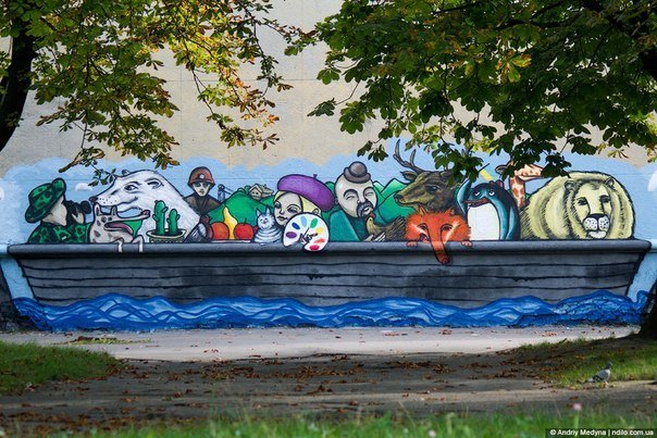 "Ні, це не Ноїв ковчег. Це просто всі ми в одному човні. Хтось почувається левом, хтось — лисицею", - каже художник.