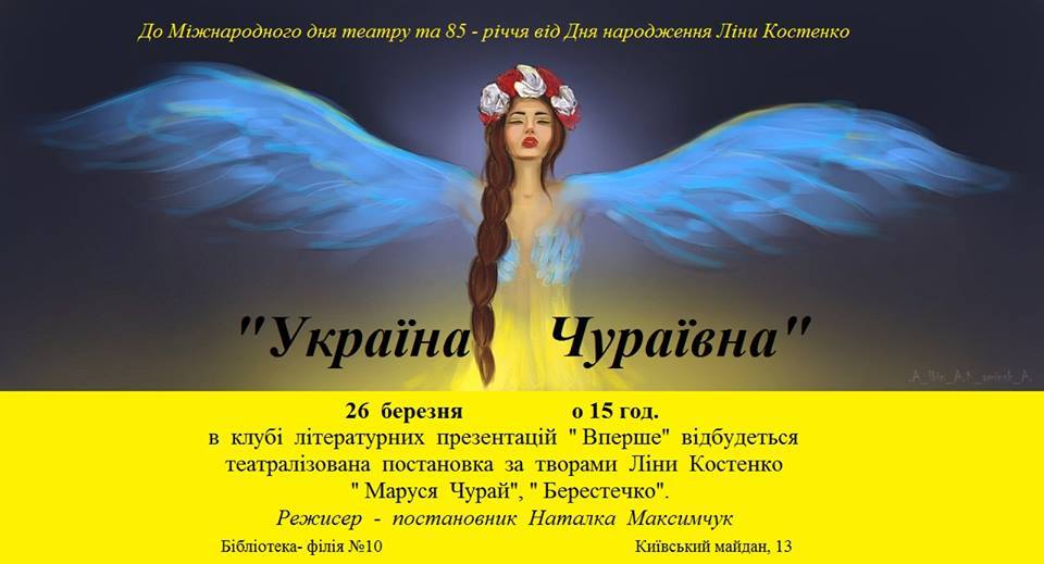 Театралізовану постановку «Україна Чураївна» за творами Ліни Костенко «Маруся Чурай» і «Берестечко» покажуть у Луцьку в четвер, 26-го березня, о 15:00 у бібліотеці-філії № 10 (Київський майдан, 13). Про це інформують організатори з клубу літературних презентацій «Вперше».