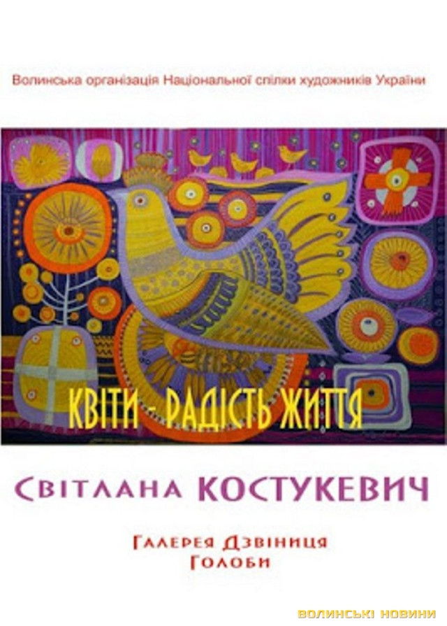 Коротко про авторку експозиції: Світлана Костукевич народилася у 1951 році у Мелітополі. Дитинство минуло у Луцьку. Батьки були вченими-агрономами і все життя працювали на Волинській сільськогосподарській станції. Навчалася у Львівському училищі прикладного мистецтва ім. Івана Труша (1967-1971), працювала у волинських художньо-виробничих майстернях, одночасно навчалася на заочному відділенні в Українському поліграфічному інституті ім. Івана Федорова за спеціальністю художник-графік, оформлення та ілюстрація книги. З 1980 року її роботи з'являються на обласних молодіжних, а згодом - і республіканських виставках. Вона є членом Національної спілки художників України з 1992 року. Її добру науку із вдячністю згадують колишні студенти Луцького державного технічного університету, де вона працювала викладачем на кафедрі дизайну. Нині вона працює у найрізноманітніших техніках: батик, розпис по шовку, акварелі, монотипії, аплікації, ткацтво. Улюблена тема робіт художниці – гармонійність природи, її краса і довершеність.