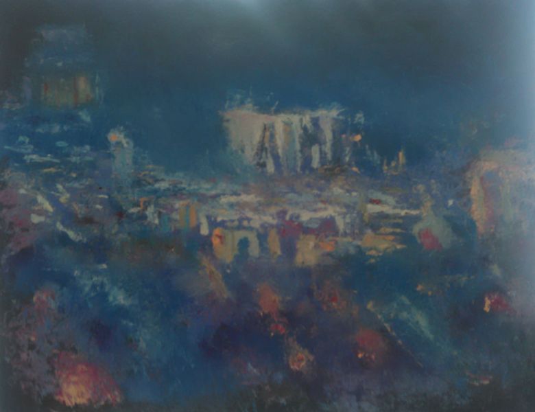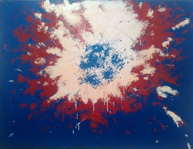 «Місто наступає» – саме така назва спонтанно зринула у розмові з художником під час обговорення з глядачами іншої картини. Але тут – інший настрій та кольори. Ніби бензинова пляма, яка розтікається по калюжі, місто розповзається брудними патьоками, забираючи природні барви річок, лісу, позбавляючи їх повітря, свіжості, легкості. Вибух наднової зірки - космічна катастрофа, яка водночас нищить та народжує. Одна з теорій походження Сонячної системи виявилася цікавою молодому митцеві у плані передачі згустку надпотужної енергії фарбами, «вибуховою» кольоровою палітрою у традиційному композиційному вирішенні.