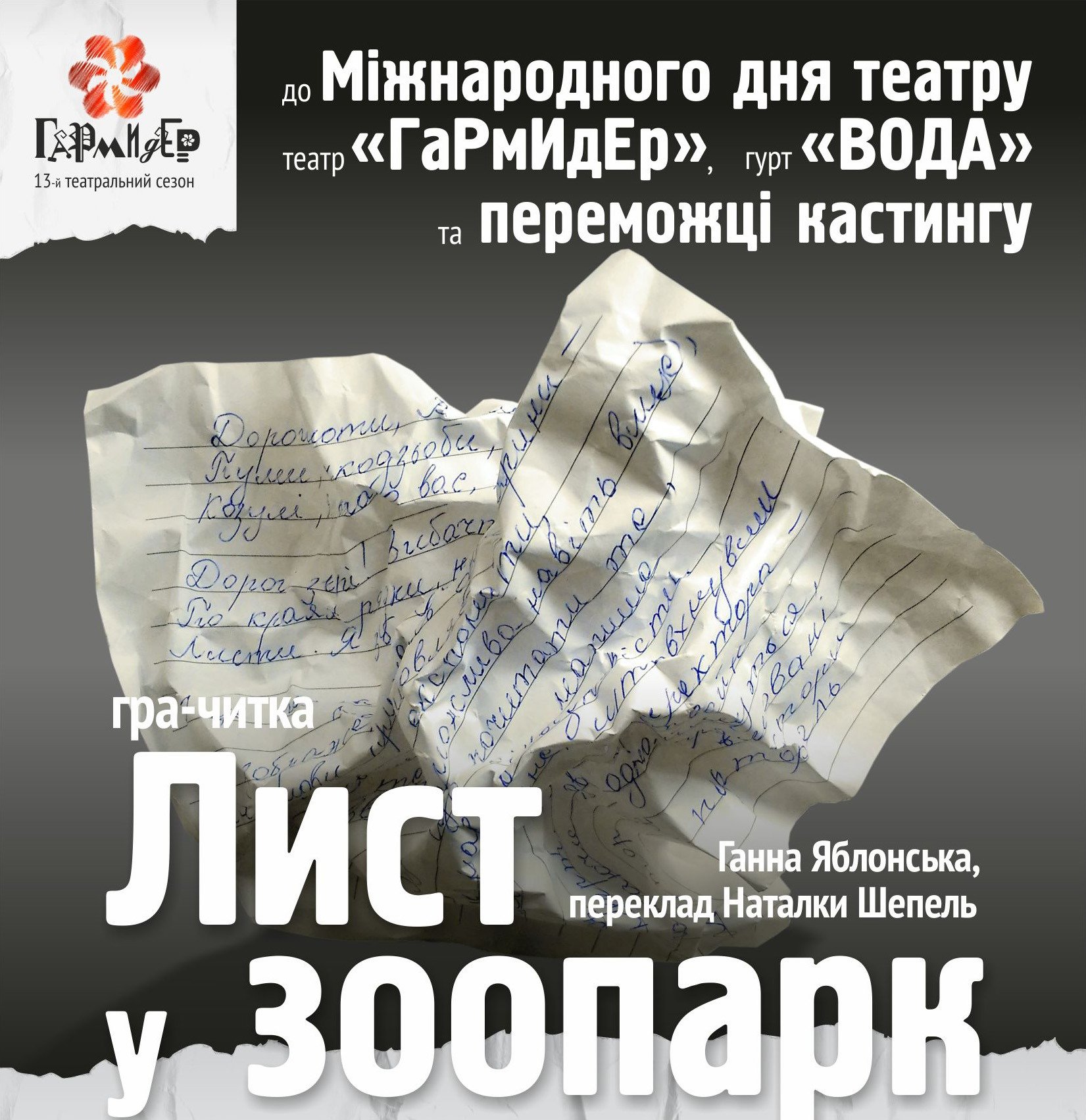Лише один раз у «ГаРмИдЕрі» відбудеться виступ акторів із експериментальною прем’єрою «Лист у зоопарку». Прем’єра відбудеться 2 квітня о 16:00 у Луцькому районному будинкові культури (вул. Ковельська, 56). Вхід вільний, повідомляють актори.