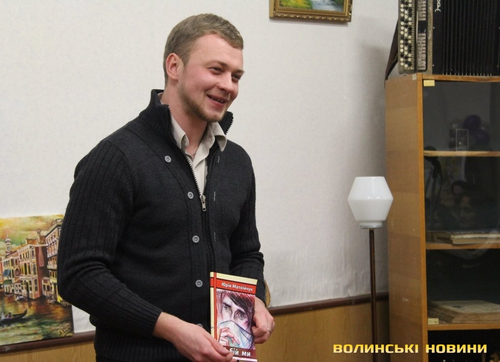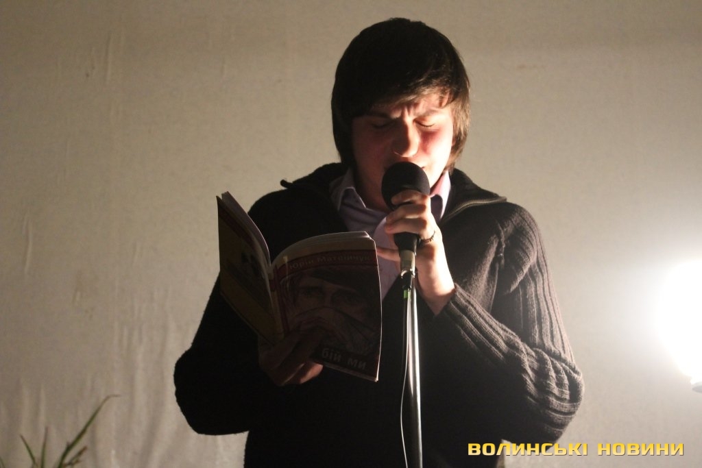 Отже, другою частиною заходу стала презентація збірки «О..бій…ми» молодого поета з міста Острог Юрія Матвійчука. Він читав не лише інтимну лірику. Так, у одному з віршів йшлося про урочище Сандармох, де за часів сталінізму були розстріляні Микола Куліш, Лесь Курбас, Валер’ян Підмогильний, Микола Зеров, Валер’ян Поліщук та Микола Вороний. Чимало віршів зі збірки були пов’язані із перебуванням автора у Санкт-Петербурзі. Пролунала й поезія, присвячена нещодавнім подіям у Києві: