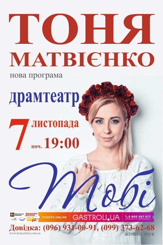 У Луцьку Тоня Матвієнко виступить 7 листопада в облмуздрамтеатрі. Початок о 19.00.