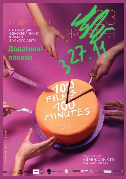 Третій всеукраїнський фестиваль екстремально короткого кіно «100 фільмів за 100 хвилин» знову готовий дивувати жителів різних куточків України. Покази проекту у Луцьку відбудуться 27 листопада-3 грудня, в кінотеатрі «Адреналін Сіті».