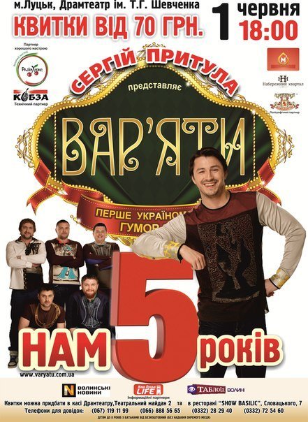 Проекту «Вар’яти», який створив Сергій Притула, виповнюється 5 років. З цього приводу 1 червня у Луцьку відбудеться концерт під назвою «Найкраще» за їх участю.