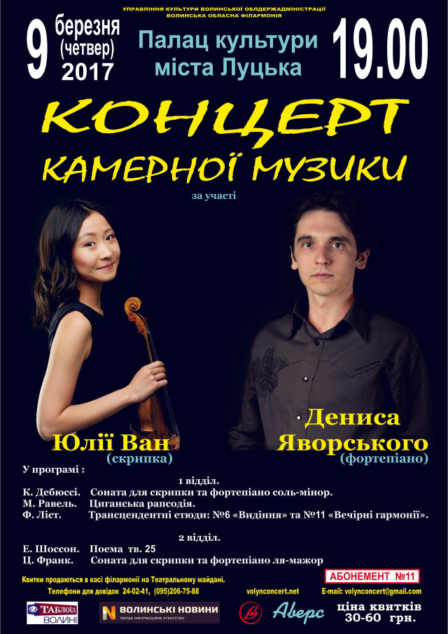 Концерт камерної музики, де прозвучать такі великі композитори як К.Дебюссі, М.Равель, Ф.Ліст, Е.Шоссер та Ц. Франк, у виконанні молодих, амбіційних та талановитих артистів Юлії Ван (скрипка) та Дениса Яворського (фортепіано), відбудеться 9 березня у Палаці культури міста Луцька.