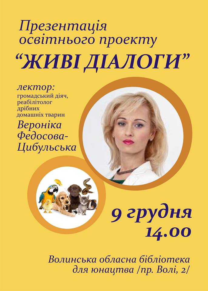 Волинська обласна бібліотека для юнацтва спільно з громадським діячем та реабілітологом дрібних домашніх тварин Веронікою Федосовою-Цибульською розпочинає цикл освітніх лекцій «Живі діалоги». Про це повідомляють організатори заходу.