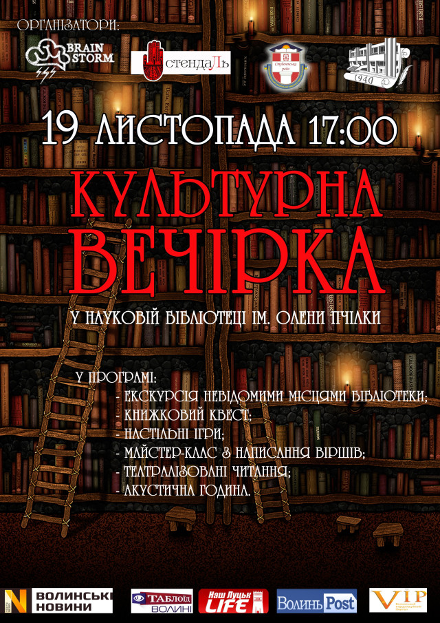 У четвер, 19 листопада, лучан запрошують на «Культурну вечірку» до Волинської державної обласної універсальної наукової бібліотеки імені Олени Пчілки. Про це повідомляють організатори.