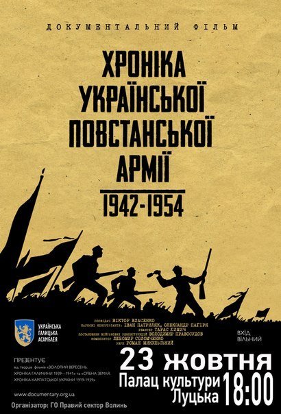 Прем’єра документального кіно «Хроніка української повстанської армії 1942-1945» відбудеться у Луцьку 23 жовтня о 18:00 у Палаці культури міста Луцька.