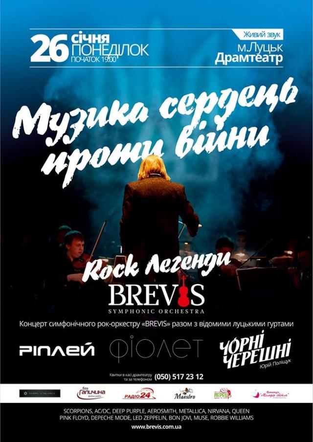 Так, у Луцьку вже сьогодні, 26 січня, виступлять рок-легенди - Симфонічний рок-оркестр BREVIS з програмою «Музика Сердець Проти Війни».