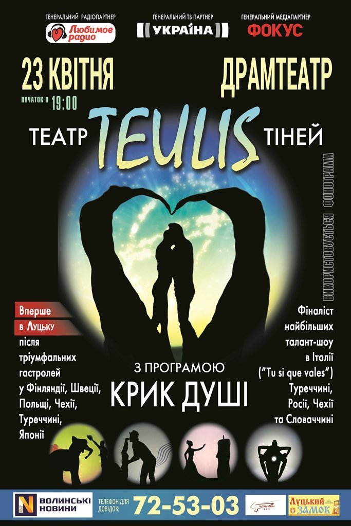 Театру Тіней TEULIS з програмою "Крик душі" відвідає Луцьк. 23 квітня грандіозне дійство відбудеться в обласному муздрамтеатрі. Після гастролей Європою, Туреччиною, Японією артисти - нарешті в нашому місті.