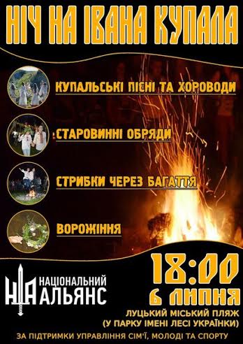 На свято Івана Купайла молоді люди стрибають через вогнище, співають пісень, а дівчата гадають на свого судженого. Вони плетуть вінки і кидають на воду. В яку сторону вінок попливе, звідти і буде майбутній коханий родом.Організатори заходу запрошують всіх охочих на захід, приурочений святу Івана Купайла. На присутніх чекатиме таємнича та запальна атмосфера, хороші люди та багато чудових вражень, - кажуть у Нацальянсі.