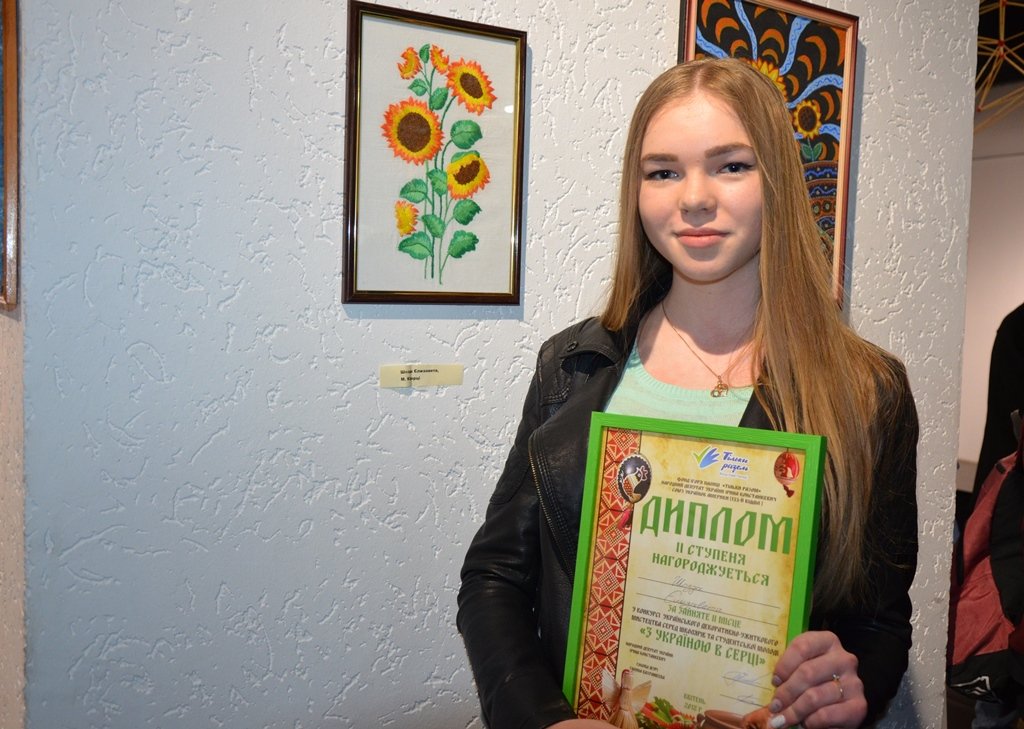Вишиті гладдю соняшникии Єлизавети Шозди зайняли друге місце. Студентка Ківерцівського медичного коледжу розповіла, що вишивати навчилася у 9 класі. Це заняття їй подобається, тому не залишає його.