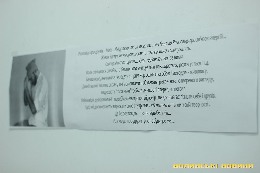 Мешканці обласного центру матимуть змогу оцінити витвори волинського художника Констянтина Мазурика з 29 січня й до 8 лютого включно.«Це - розповідь про друзів моїх, які далеко, які за межами, і які близько. Це розповідь про зв'язок енергій, живих і штучних, які допомагають нам бачитись і спілкуватись. Сьогодні я спостерігав за нею і за нами. Коли ти спілкуєшся онлайн, то багато чого зміщується, накладається, розтягується… Бачиш нове, яке можна передати старим хорошим способом і методом – живопису. Дивні і великі обличчя на екрані, які моментами набувають прекрасно-спотвореного вигляду, надихають. Тоді «тихенько» робиш снепшот і вперед, за пензля. Неймовірні деформовані пропорції, перебільшені пропорції, колір - і це допомагає пізнати себе і друзів. Ідеї, що допомагають життєвій творчості. Це і є розповідь. Розповідь без слів. Розповідь про друзів і розповідь про мене», - саме так охарактеризував власну виставку художник.