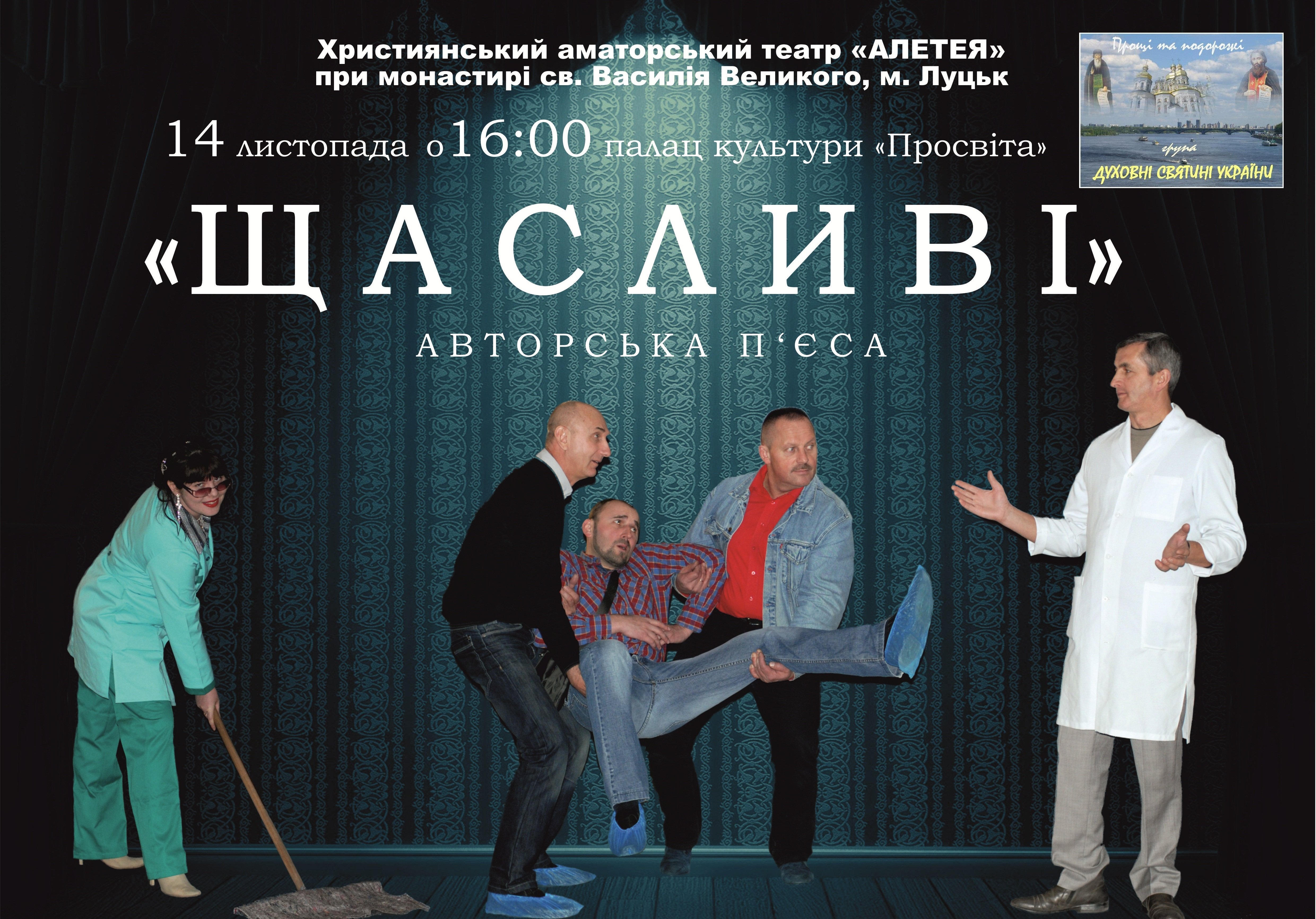 Всіх охочих лучан і гостей міста запрошують відвідати авторську виставу «Щасливі» Християнського аматорського театру «Алетея», Луцького Василіянського монастиря, під керівництвом отця Августина Запоточного, ЧСВВ, та пані Ірини Бурко.