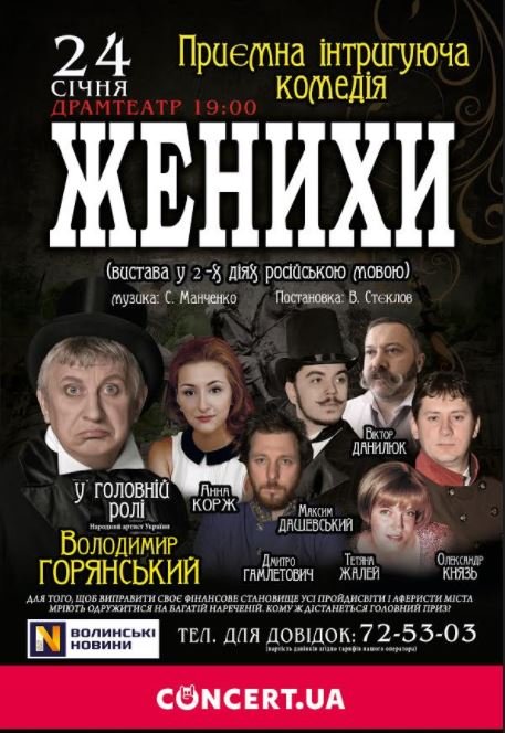 Інтригуючу комедію «Женихи», за п’єсою Миколи Гоголя «Одруження», представлять у Луцьку 24 січня. Показ відбудеться у волинському облмуздрамтеатрі 0 19.00.