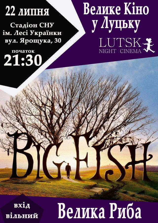 Липневий кінопоказ «LutskNightCinema» розпочнеться наступної п'ятниці, 22 липня, о 21:30. Цього разу організатори обрали кінострічку «Велика риба».