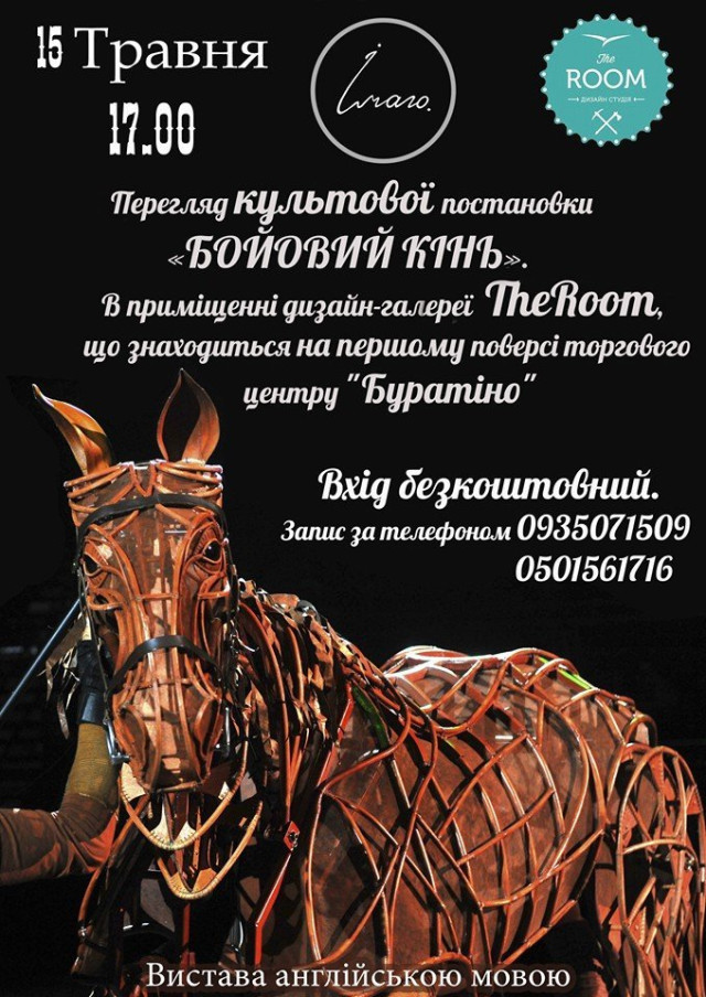 15 травня о 17:00 у дизайн-галереї «The Room», що на першому поверсі ТЦ «Буратіно», розпочнеться кінопоказ вистави «Бойовий кінь». Постановка Королевського Національного театру Великобританії за романом Майкла Морпурго, адаптована для сцени Ніком Стаффордом, - дивовижна історія дружби та відданості під час Першої світової війни.
