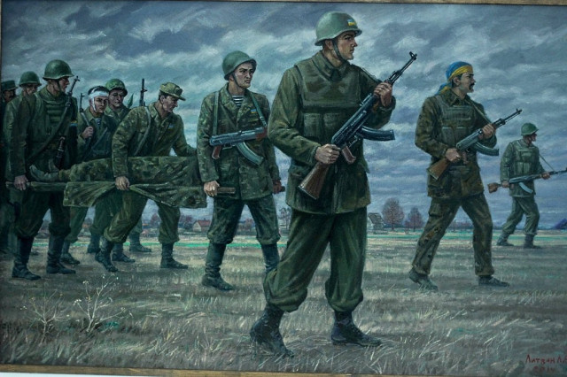 На виставці показали картини, присвячених неоголошеній війні, що відбувається на сході України. Усі такі витвори мистецтва пронизані патріотичним духом і змушують навіть невеликих знавців високого та прекрасного замислитись над тим, що відбувається у рідній державі. Зокрема, волинський художник Леонід Литвин представив власне «дітище», створене у 2014 році, під назвою «У зоні АТО». Автор продемонстрував фрагмент із важких реалій сьогодення українських захисників.Окрім того, неймовірне враження на гостей виставки справила інсталяція на тему «Інформаційна зброя – зброя масового ураження». Вона включає в себе телевізор, всередині якого зображені слова, що, ймовірно, символізують наслідки «зомбування» людей проросійськими ЗМІ, а також сліди від куль та безпосередньо самі кулі, що впиваються в екран.Не обійшлось і без мальовничих зимових пейзажів.