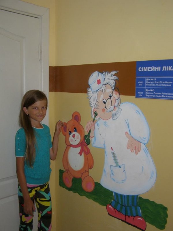 "Мікрорайон ЛПЗ має "Центр первинної медико-санітарної допомоги". Там і для діток лікарі є, і для дорослих! Тепер дитяче відділення прикрашене гарними малюнками! І малюнки ці не прості! Їхній автор Наталя Чубко - художниця, яка започаткувала власний стиль "чубківка" (сліпучо усміхається на світлині). Її роботи є у багатьох куточках світу! Тож цілком ймовірно, що колись ми ті стіни продамо з аукціону", - написала лучанка.