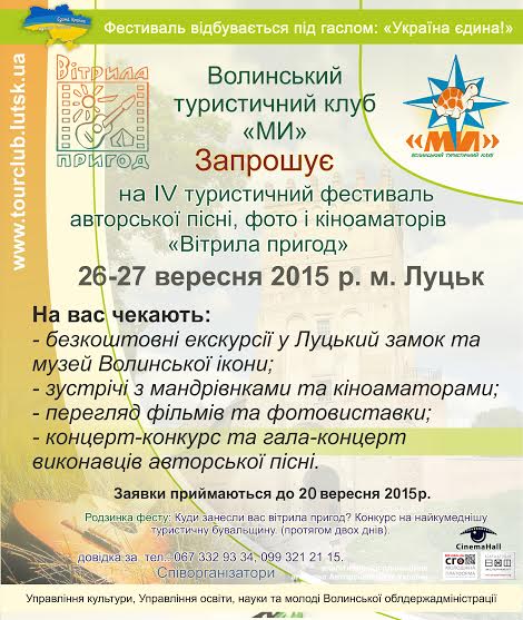 Волинський туристичний клуб «Ми» запрошує до древнього Лучеська на IV туристичний фестиваль авторської пісні, фото і кіноаматорів «Вітрила пригод», який відбудеться 26-27 вересня 2015 року.