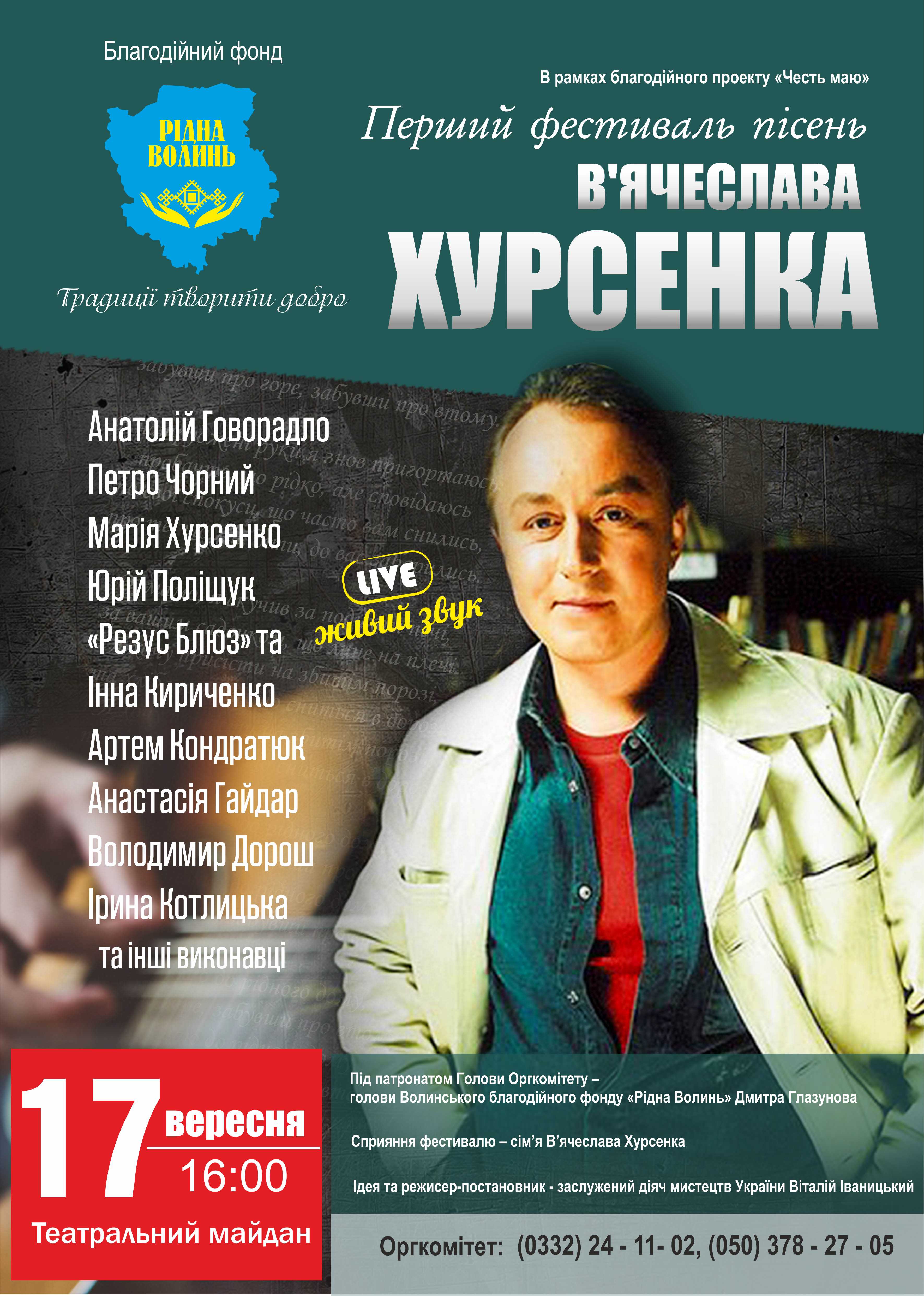 Перший фестиваль пісень В’ячеслава Хурсенка відбудеться у Луцьку 17 вересня.