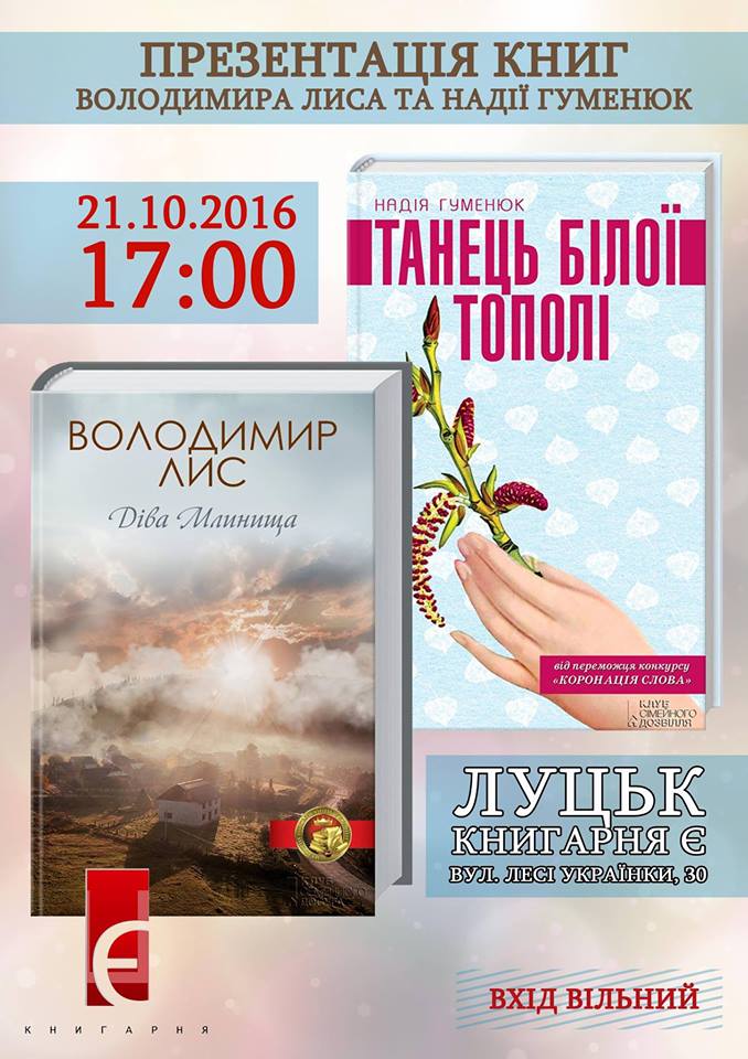 Володимир Лис та Надія Гуменюк презентують нові книги. Презентація книг «Діва Млинища» і «Танець білої тополі» відбудеться у п’ятницю, 21 жовтня у книгарні «Є», повідомили організатори.