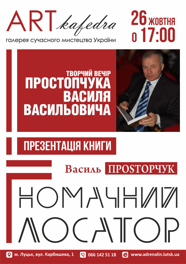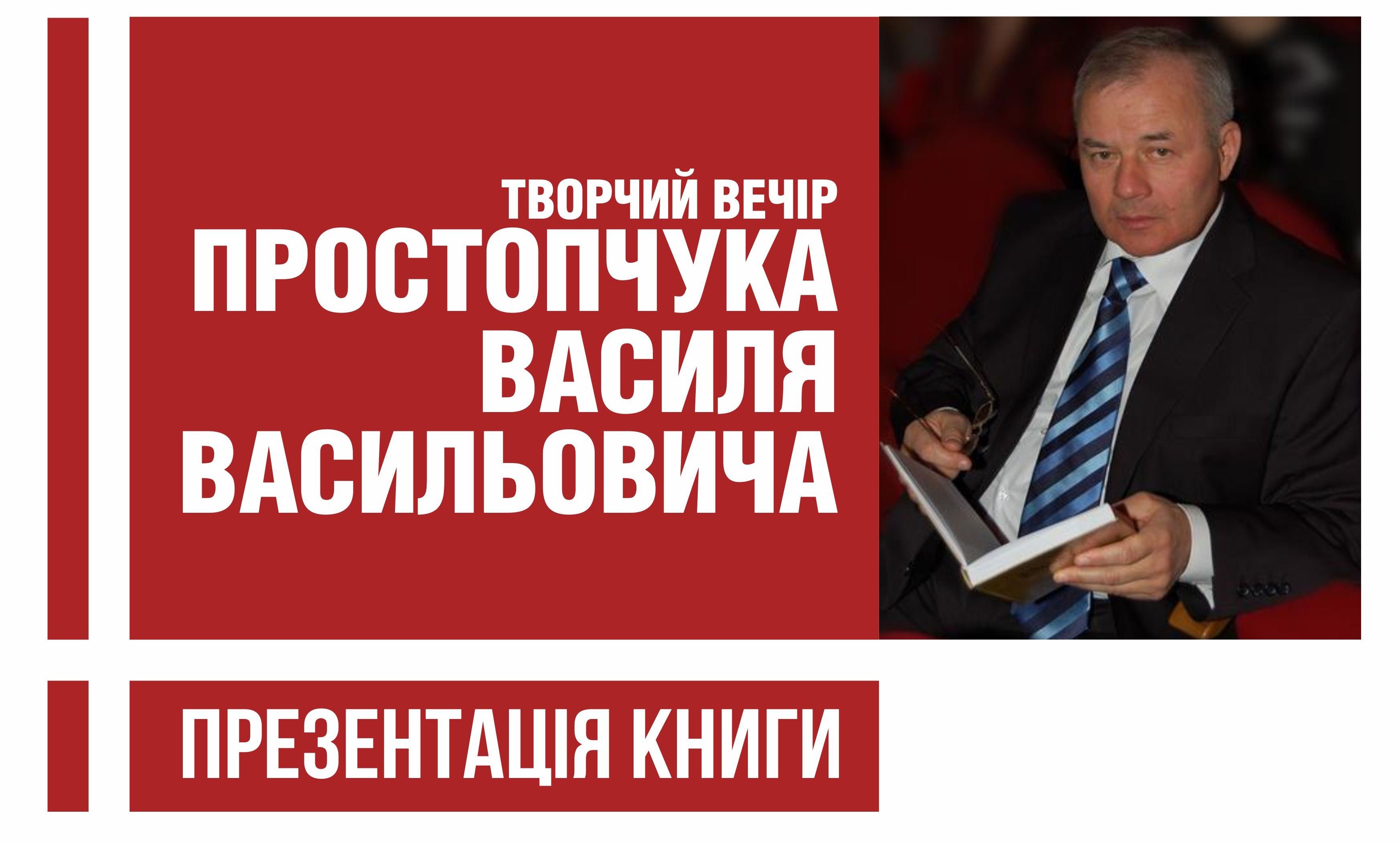 Творчий вечір українського поета, заслуженого журналіста України Василя Простопчука відбудеться 26 жовтня о 17:00 годині у Галереї сучасного митецтва України "Арт-кафедра" (вул. Карбишева, 1, Адреналін Сіті).