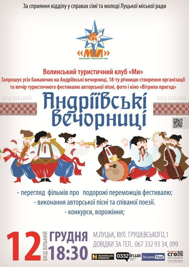 Лучан та гостей міста запрошують на Андріївські вечорниці, які традиційно влаштовують увечері 12 грудня - напередодні дня святого Андрія Первозванного, який відзначають 13 грудня.