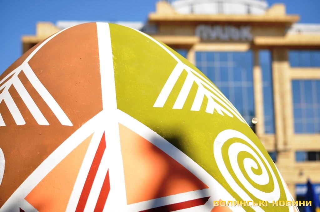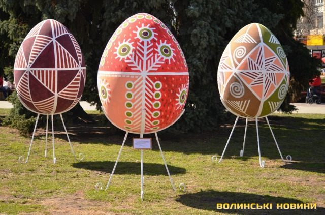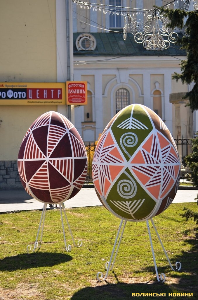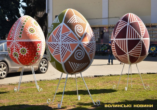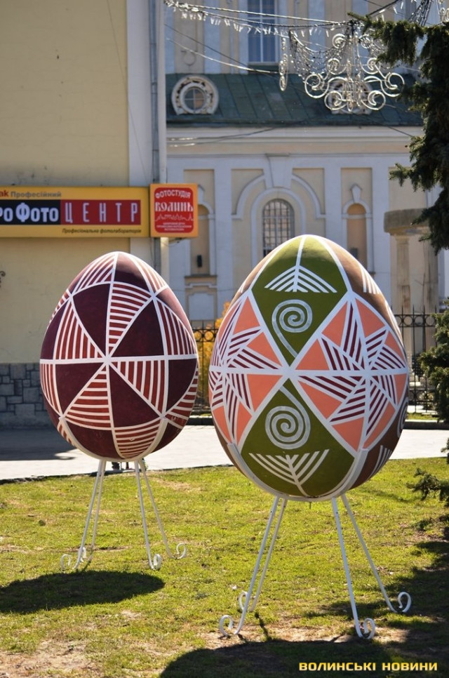Театральний майдан Луцька уже змінює своє обличчя до Великодня – тут встановили великі писанки в межах арт-проекту «Волинська писанка. Триєдине».