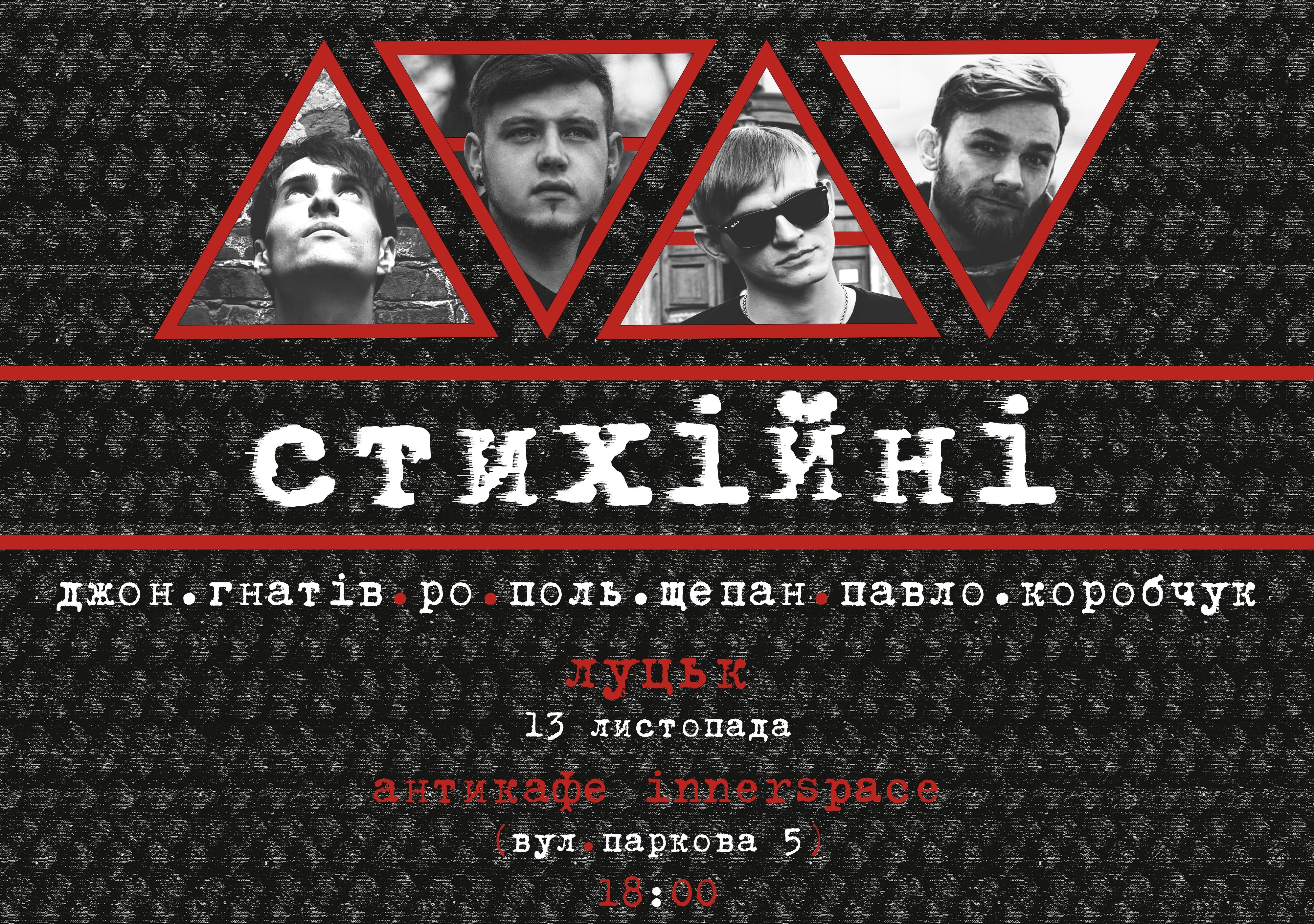 Зустріч із учасниками проекту «Стихійні» відбудеться у неділю, 13 листопапа, о 18.00 у приміщенні антикафе InnerSpace (вулиця Паркова, 5).