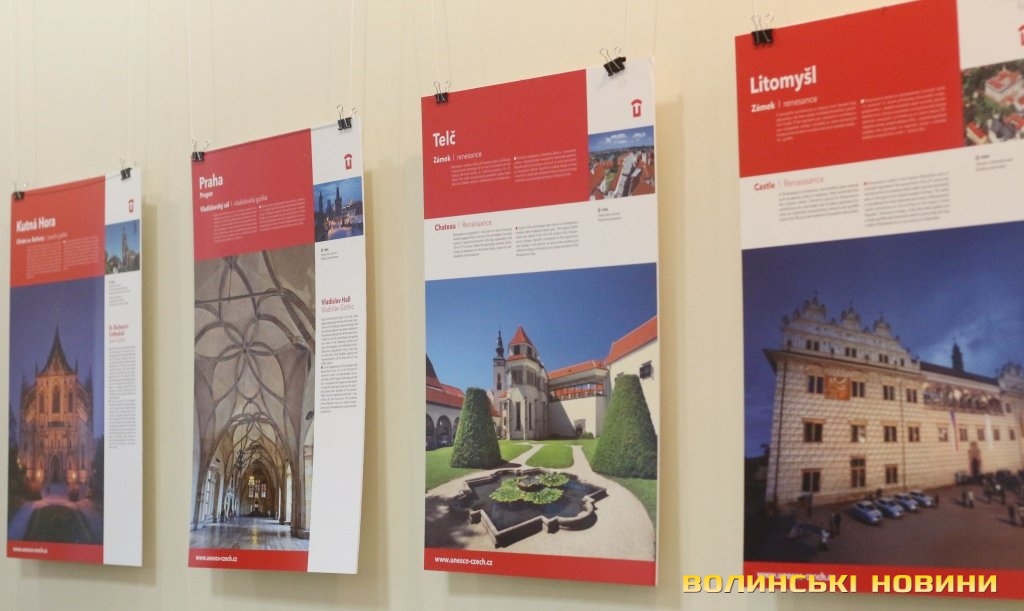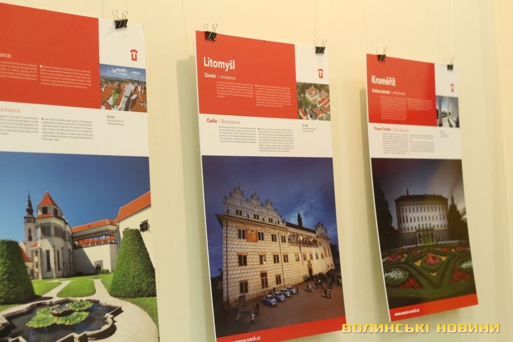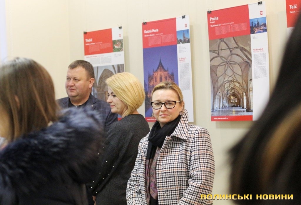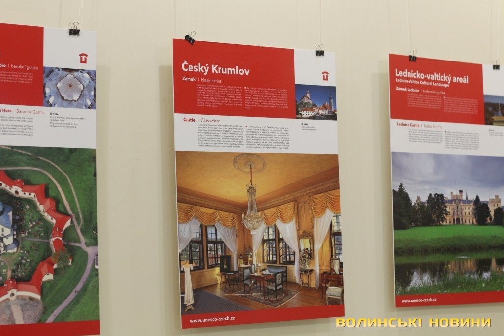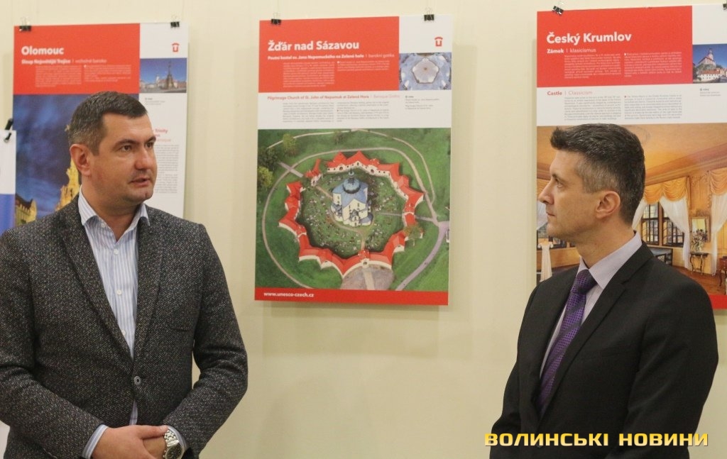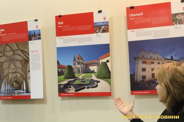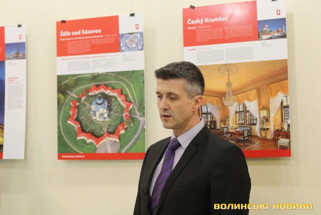 Він розповів, що виставка про річницю Оксамитової революції розміщена у Східноєвропейському національному університеті, вечорами відбуватимуться покази чеських кінофільмів. Сьогодні у рамках виставки в арт-галереї «Луцьк» демонстрували світлини 12 чеських об’єктів культурної спадщини ЮНЕСКО. Як наголосив генеральний консул, у Чехії варто побачити не лише історичний центр Праги, що входить до списку світової культурної спадщини ЮНЕСКО, а й низку інших цікавих місць. Окрім цих 12 матеріальних пам’яток, до списку ЮНЕСКО цього року додали ще дві – гірничий регіон Krušné hory (Рудні гори) на кордоні з Німеччиною, де видобували срібну руду та олово, а також кінський завод у місті Кладруби над Лабем з прилеглими ділянками, де розводять унікальну породу тягових коней, які у минулому служили при цісарському дворі Габсбургів.