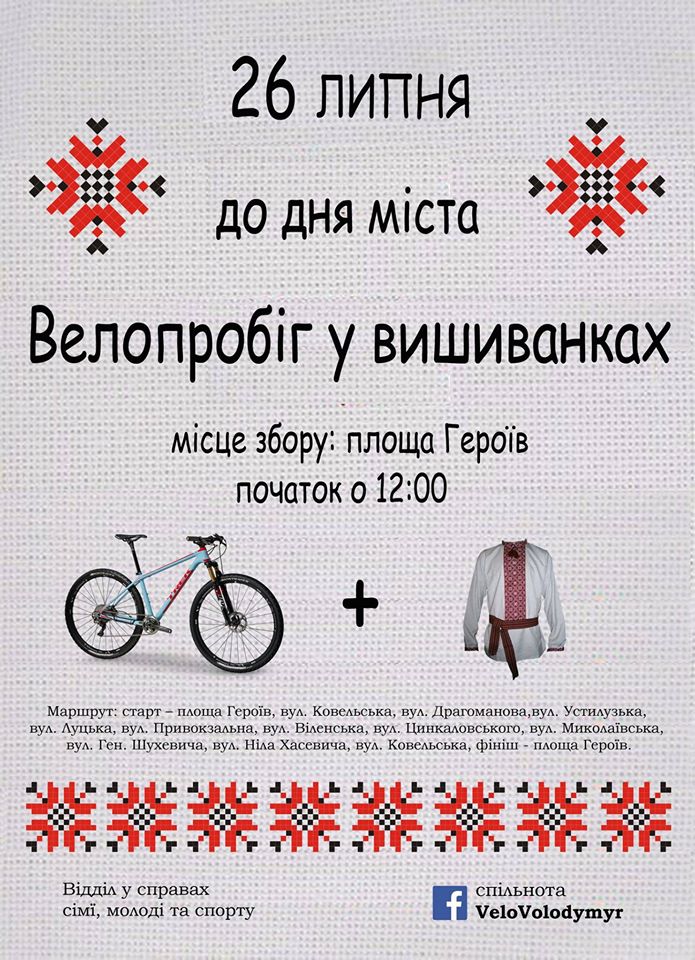 Володимир-Волинський 26 липня святкуватиме 1027- му річницю. З нагоди Дня міста Володимир-Волинський запрошує усіх прихильників двоколісного транспорту на велопробіг у вишиванках – інформує спільнота VeloVolodymyr в соціальній мережі фейзбук.