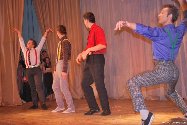 Студент фізичного факультету Костянтин Чорний у чудернацькому костюмі та студент Хімічного факультету, Роман Пасєка танцювали рок-н-рол.