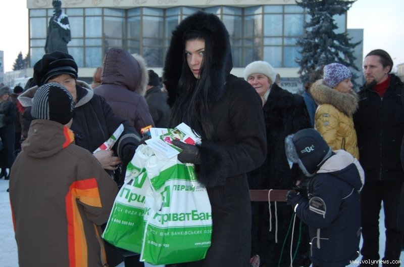 "Під час дійства на Театральній площі молодь роздавала перехожим солодощі та рекламні листівки «Приватбанку»..."