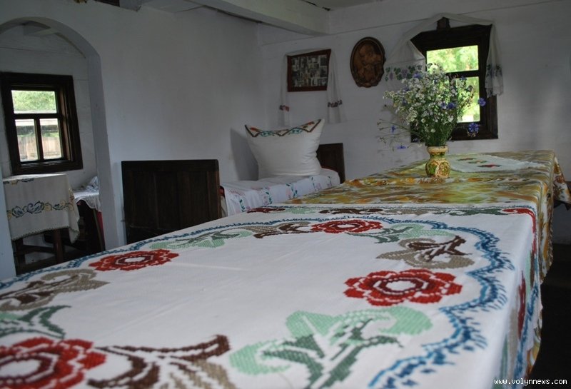 Зате відчинені двері хаток, які показують побут українських селян минулого століття. Старі фотокартки, ікони, вишивані рушники та портрет Кобзаря – як і має бути, усе дихає стариною.