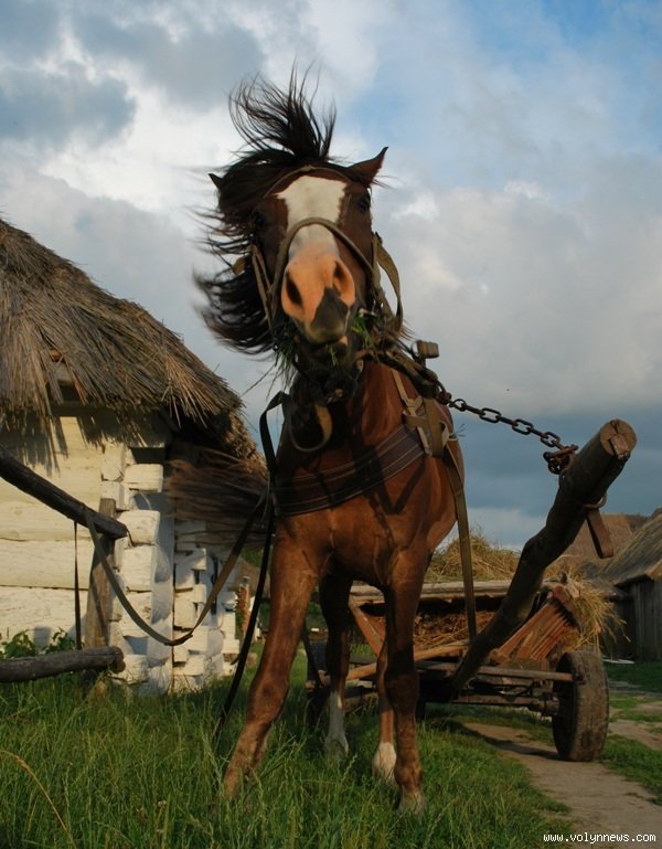 Домашня худоба тут, ніби привчена до спалахів фотокамер. Кінь, який пасеться біля «хатки-мазанки», позує, елегантно трясучи гривою.