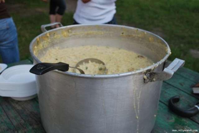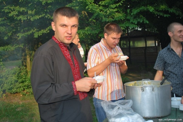 Спробувати куліш приїхав і радник луцького міського голови, депутат облради Ігор Гузь. Оксана Лойко каші не жаліє і накладає депутату по повній.
