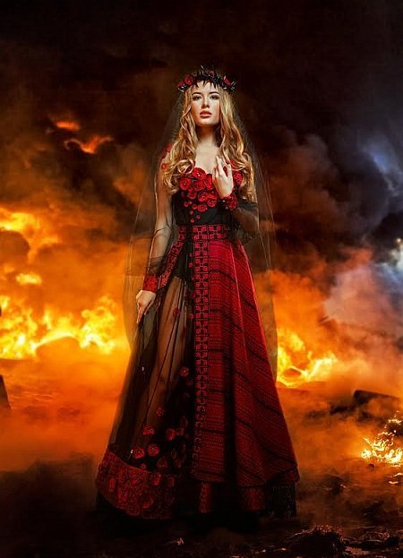 Завершує образ терновий вінок з червоними маками та чорним вельоном.