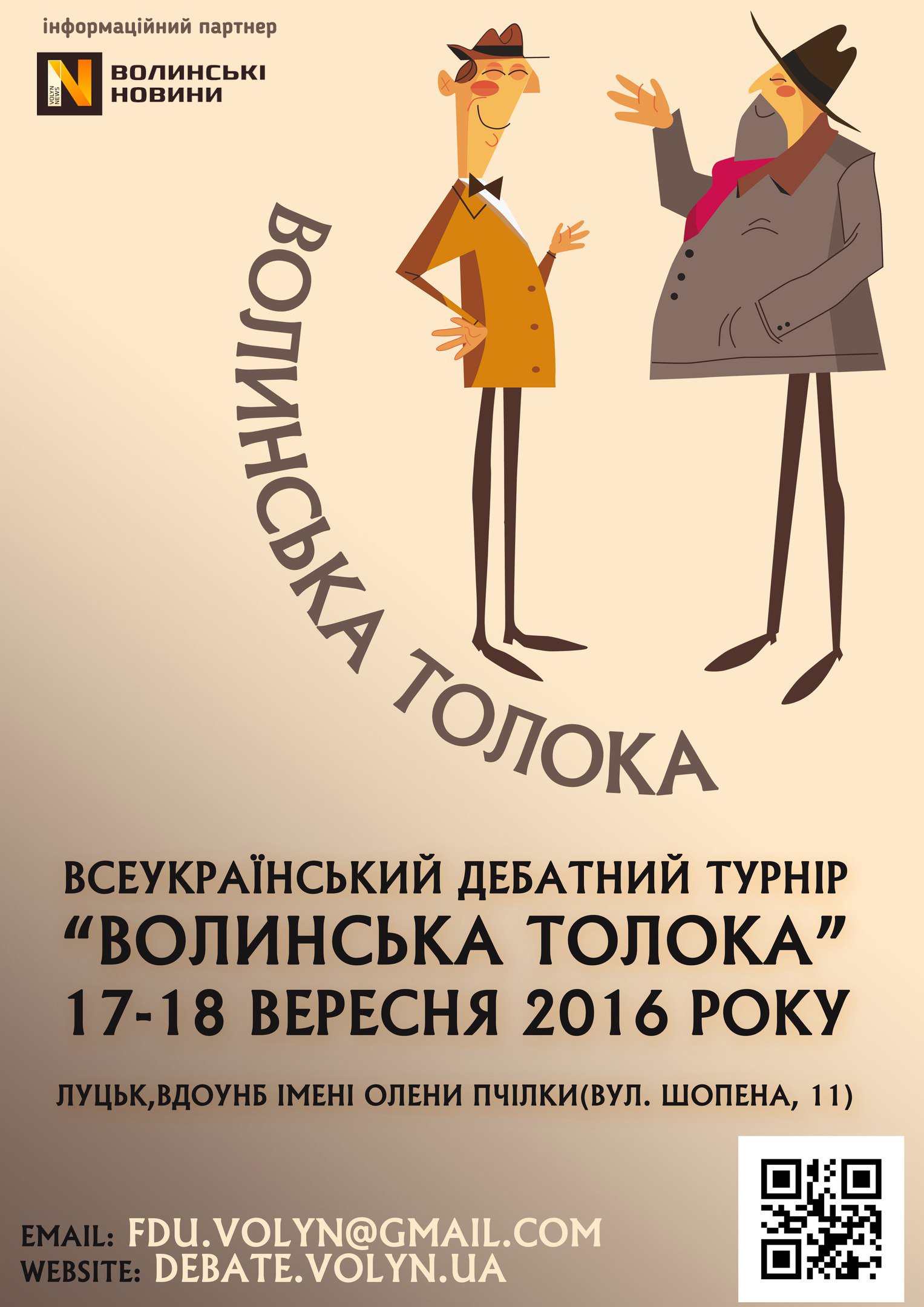 «Хочеш бути обізнаним у всіх сферах суспільного життя? Вміти підтримувати розмову на політичні, економічні, культурні чи моральні теми? Тоді тобі – до нас!», - переконують організатори та зазначають, що 17-18 вересня в Луцьку відбудеться всеукраїнський дебатний турнір «Волинська толока», в якому візьмуть участь команди з усієї України. Захід відбудеться у ВДОУНБ ім. Олени Пчілки (вул. Шопена, 11). Початок: о 10:00.