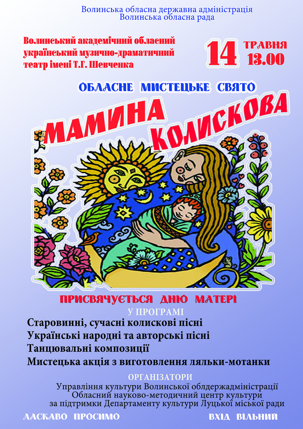 Мистецьке свято «Мамина колискова», присвячене Всеукраїнському Дню матері, відбудеться 14 травня 2017 року в приміщенні Волинського академічного обласного українського музично-драматичного театру імені Т.Г. Шевченка, повідомляють організатори.