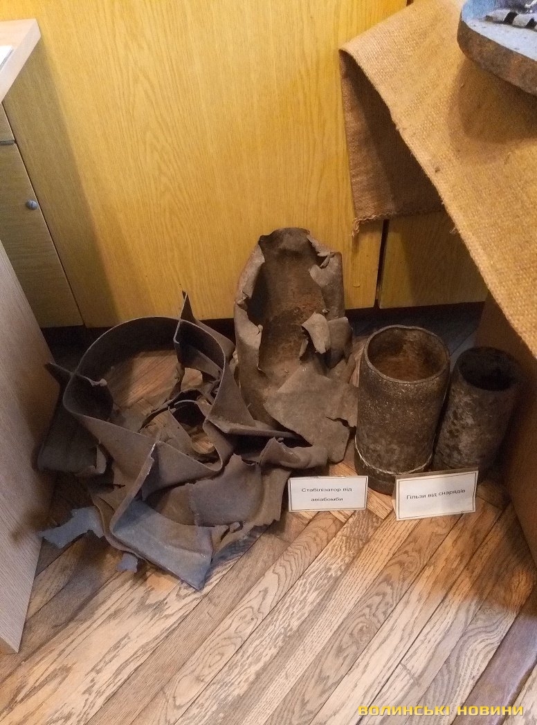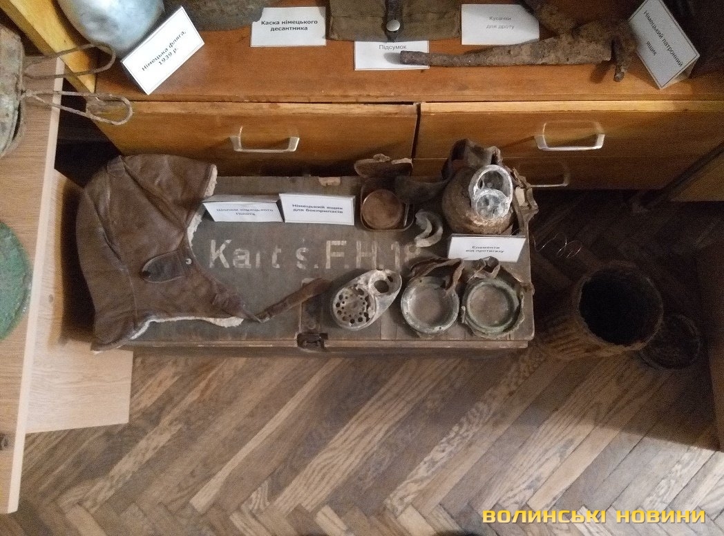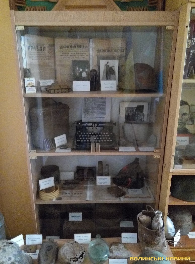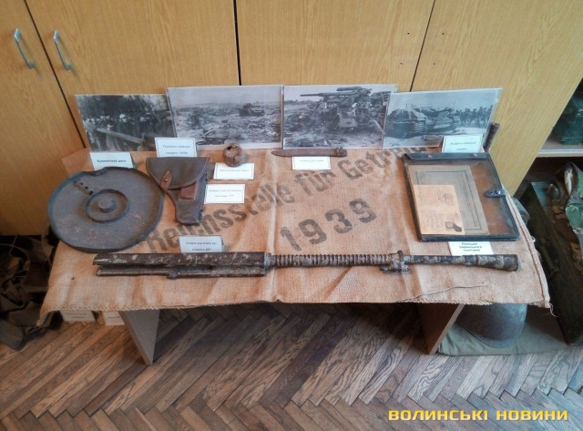 Він містить унікальні експонати - каски солдатів Вермахту, шапка-«будьоновка», американська друкувальна машинка, оригінали радянських газет того часу, ящики для патронів, залишки авіаційних бомб та снарядів, моделі німецьких та радянських танків, легендарний ППШ, радянські та нацистські державні нагороди, фотографії німецьких вояків та їх сімей, і навіть льотний шолом збитого над Волинню пілота Люфтваффе.