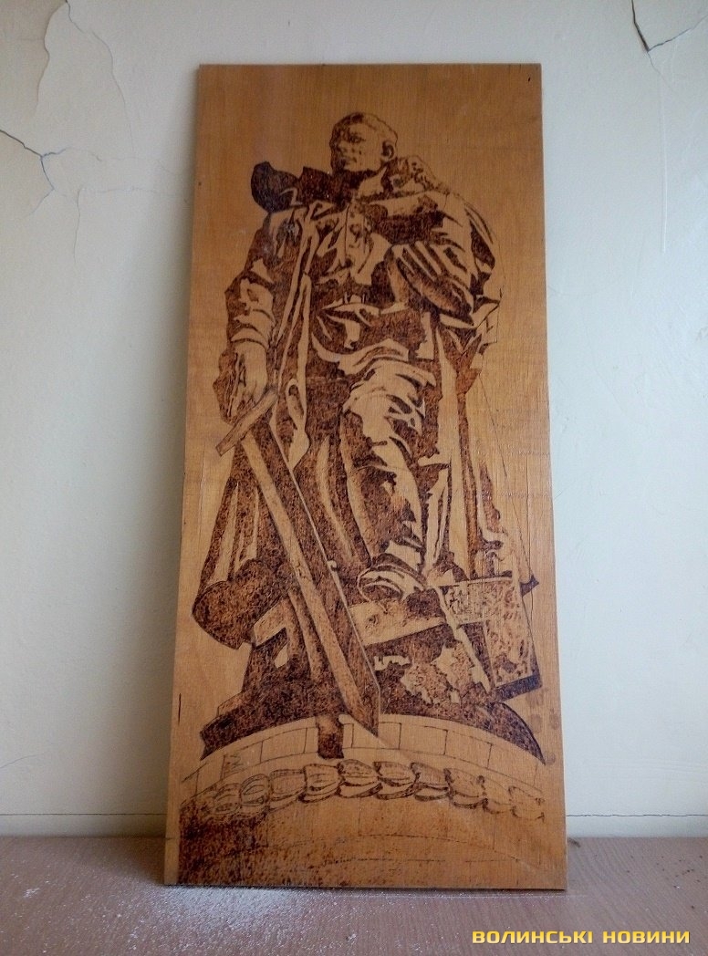 Окреме місце займає гравюра на дереві, на якій зображений знаменитий пам'ятник Воїну-Визволителю, який встановлений в берлінському Трептов-парку.