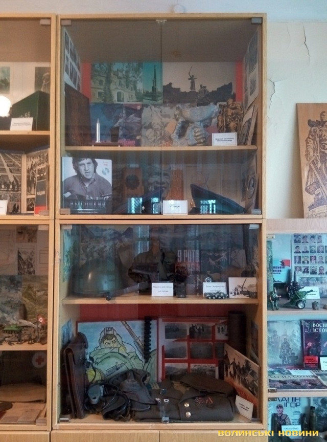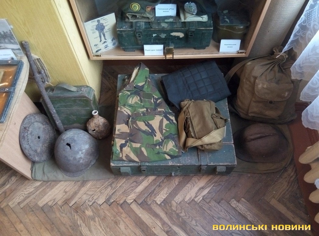 Наступний стенд кімнати-музею присвячений війні в Афганістані. На ньому розміщені унікальні документи та фотоальбоми волинян, які пройшли через афганське пекло, а також зразки військової форми та амуніції тих часів.
