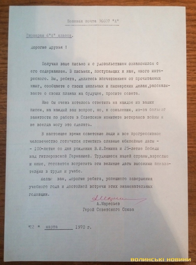 Наостанок він продемонстрував направду унікальний експонат, а саме лист учням Луцької загальноосвітньої школи № 8, написаний у 1970 році легендарним «безногим асом» Другої Світової війни, радянським льотчиком-винищувачем, Героєм Радянського Союзу Олексієм Марєсьєвим. В кінці листа стоїть автограф легендарного Героя, про якого відомий радянський письменник Борис Польовий написав свою знамениту «Повесть о настоящем человеке».
