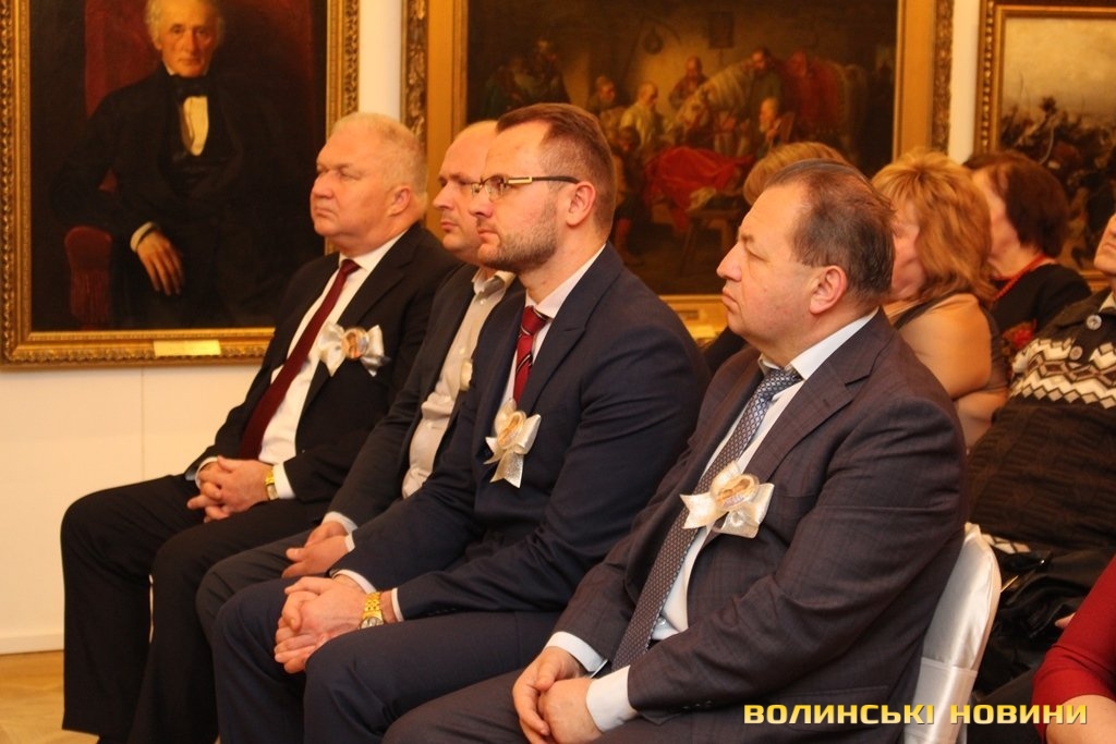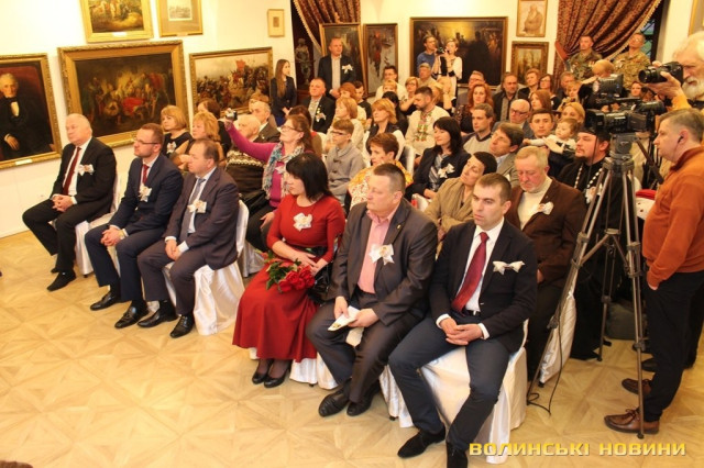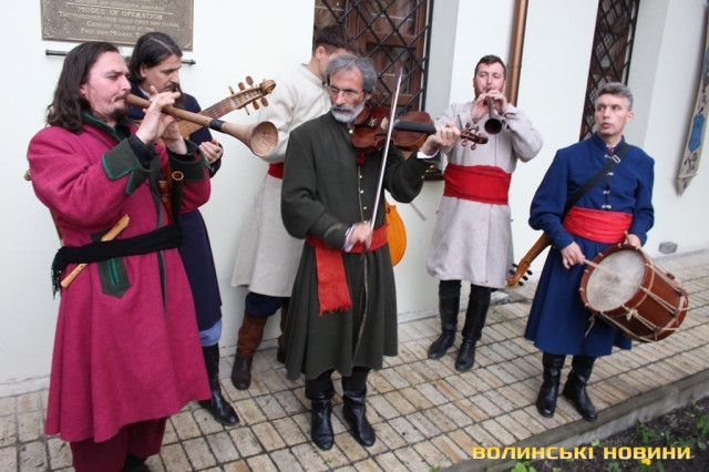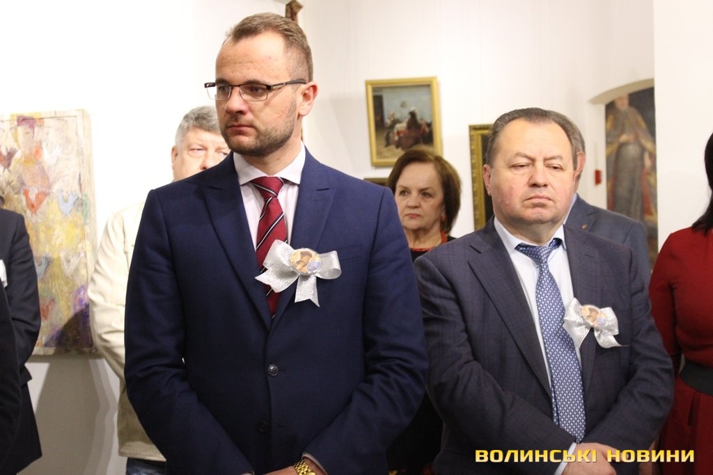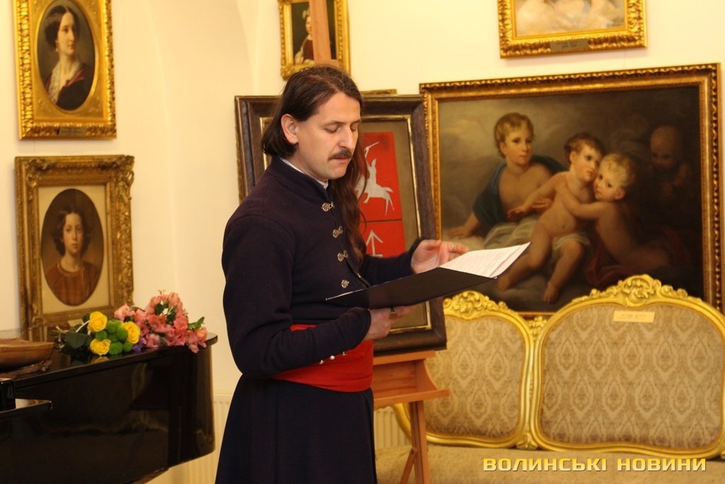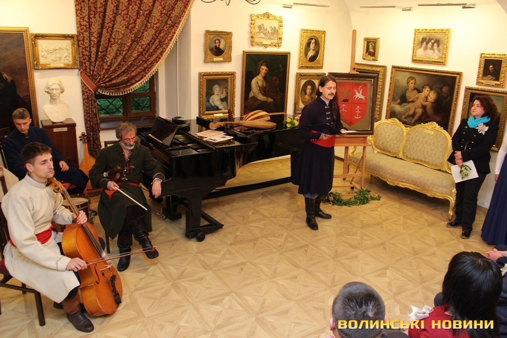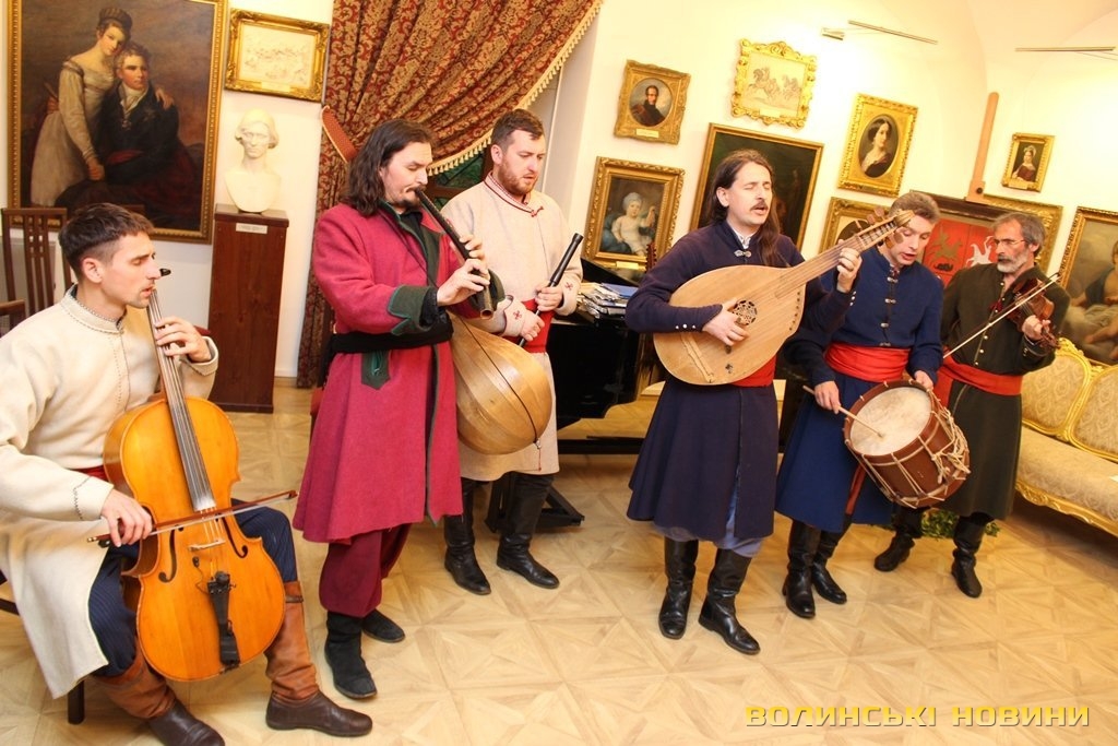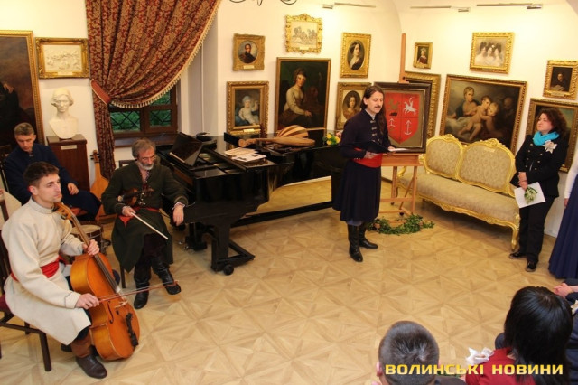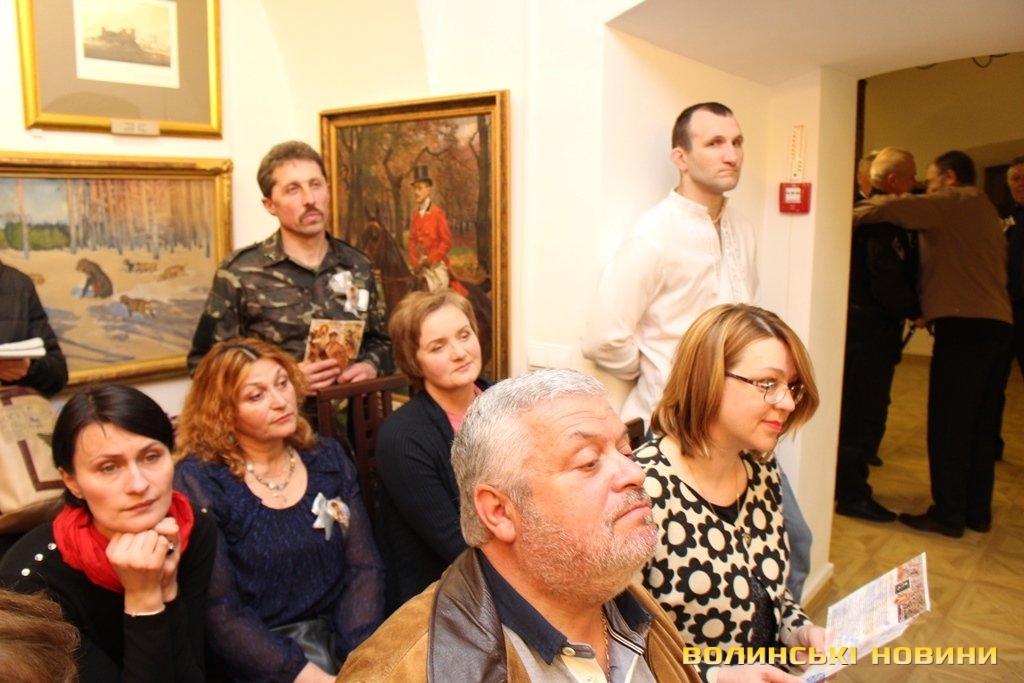 Колориту дійства додавало звучання старовинної музики від гурту «Хорея Козацька».Авторка творів Катерина Ганщук із трепетом розповідала про свої роботи та свого колегу Дмитра Стецька.«Мені дуже шкода, що я одна присутня сьогодні на заході, адже планувалася презентація удвох, але Бог сам вирішує, коли і кого кликати. Коли ми з Дмитром зустрічалися, то багато говорили про історію, Україну. Я вважаю, що на сьогодні в державі немає важливішої теми, як українськість. Тому необхідно виховувати людей у цьому дусі. Ідеологічне виховання – це те, про що ми мало зараз говоримо. Історія мало вивчена, тому сьогодення приводить нас знову до помилок. Саме тому звертаємо увагу на лицарів за духом і народженням, які підняли країну у надзвичайно складних умовах. Сьогодні ми таких лицарів бачимо в незалежній Україні, які віддають найдорожче – своє життя за свободу. Тому про це необхідно завжди говорити. Центральна моя робота представлена відомими представника аристократичних родин», - розповіла Катерина.Картини Дмитра Стецька:Із вітальним словом виступила і народний депутат України Ірина Констанкевич.
