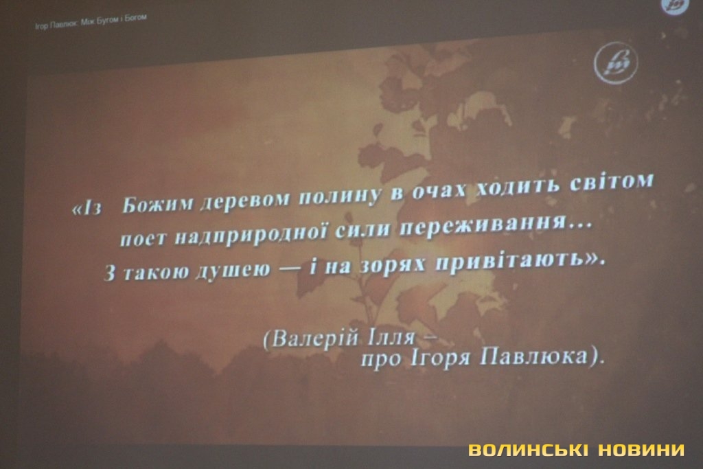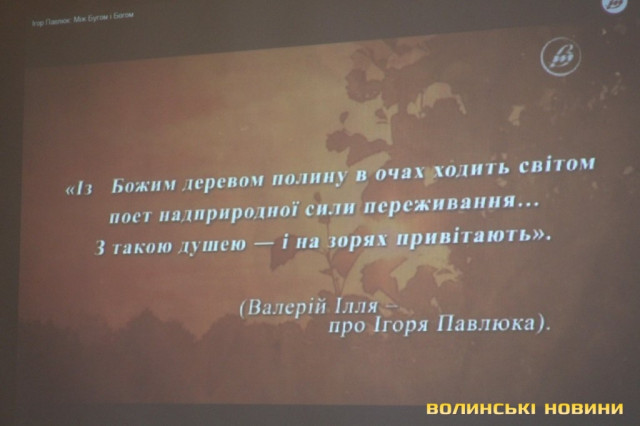 Нещодавно був створений фільм про поета «Між Бугом і Богом», англомовну версію якого зможуть побачити у 120 країнах світу. Сьогодні ж ішлося про вагу українського слова у світі та суспільстві. Ігор Павлюк зазначив, що фільм був «зроблений з любов’ю», а Волинь може давати продукти, які не соромно показувати у світі. Письменник жартує, що сам себе називає «Торчин-продуктом», адже народився у Торчині.
