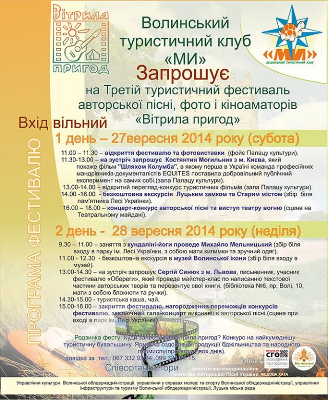 Третій туристичний фестиваль авторської пісні, фото і кіно «Вітрила пригод» відбуватиметься протягом двох днів 27-28 вересня у Луцьку. Захід присвячений дню туризму.